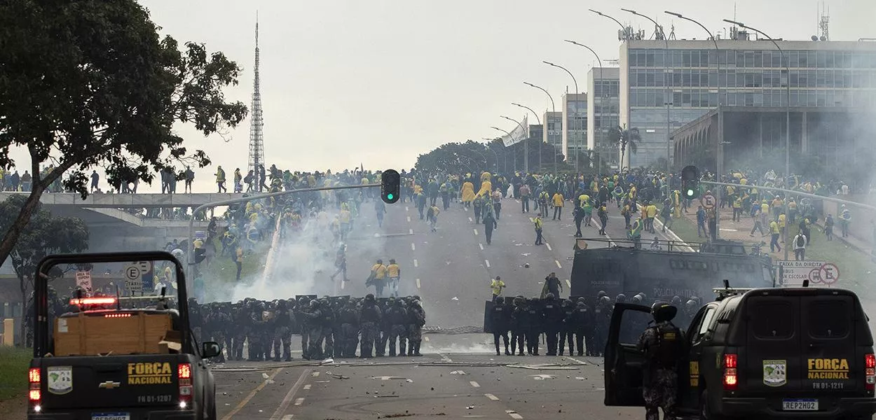 Manifestantes em confronto com a PMDF durante os atos antidemocráticos de 8 de janeiro. Foto: Joedson Alves/Agência Brasil