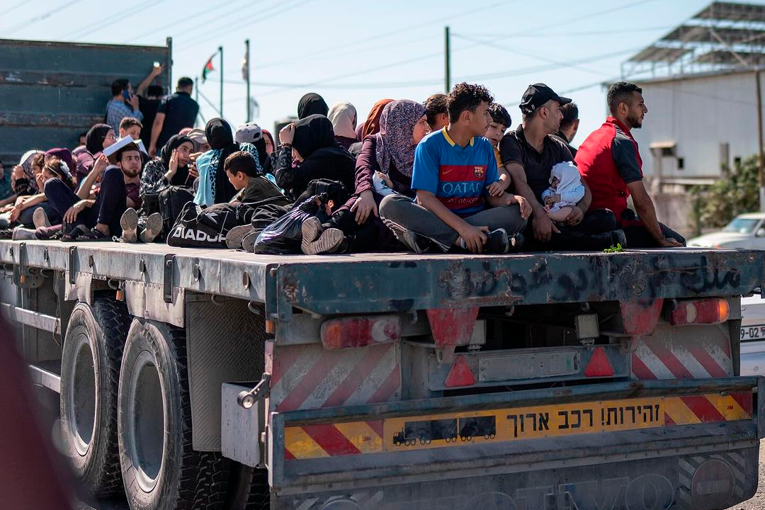 Palestinos se amontoam em caminhão para deixar Gaza. Segundo a ONU, mais de um milhão de palestinos deixam suas casas na região. Foto: Motaz Azaiza